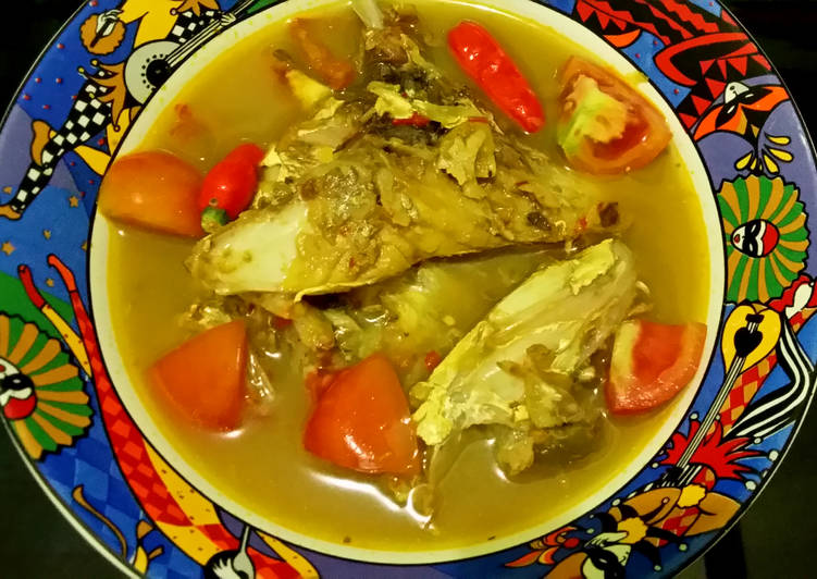 Sup kepala ikan kakap ini berkuah bumbu kunyit dan memiliki cita rasa segar dan gurih dari bawang.